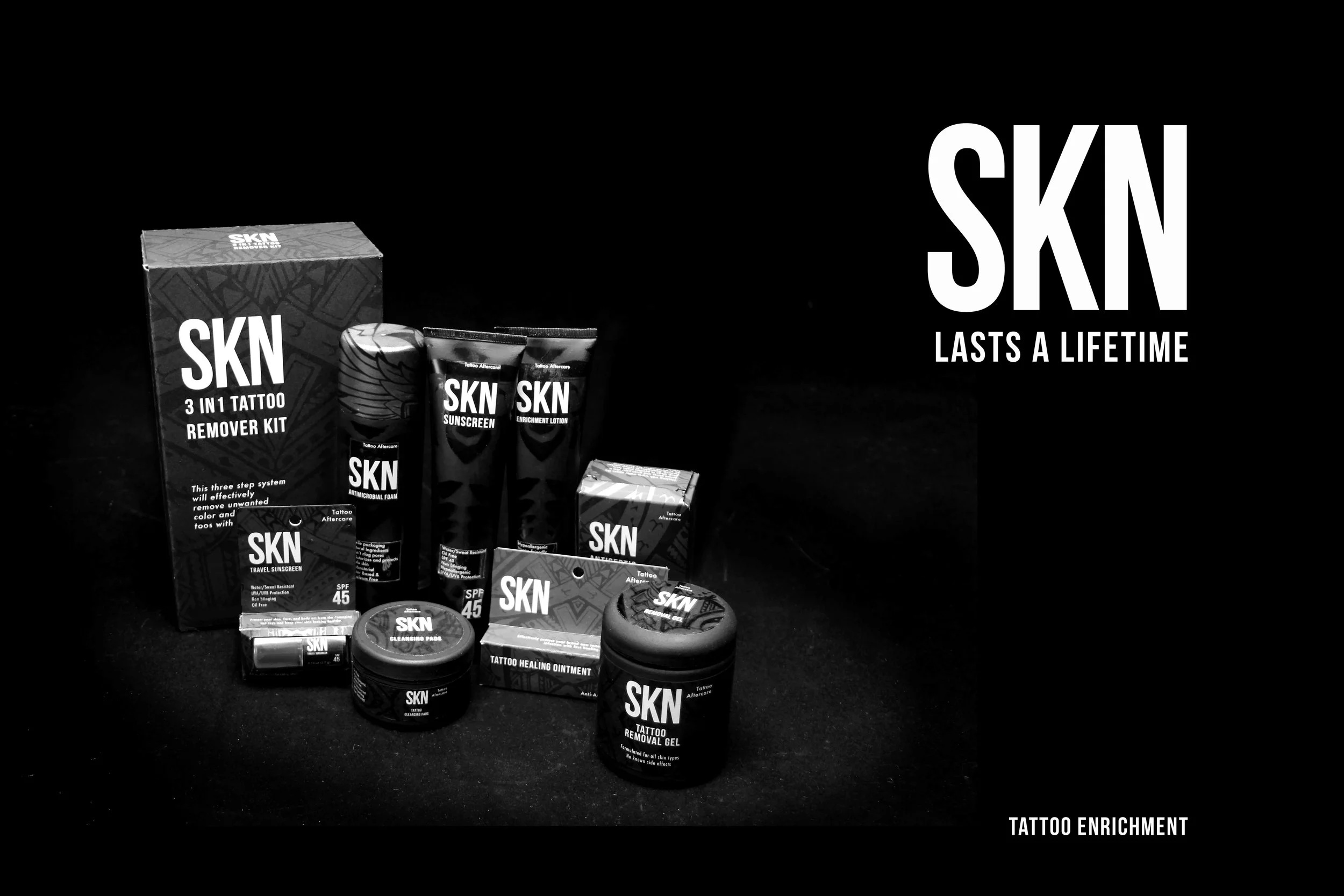 SKN (skin) is a tattoo care product. This tattoo care package includes soap, enrichment lotion, sunscreen, healing ointment, antimicrobial foam, and cleansing pads that restore, protect, and enrich tattoos to keep them looking fresh. SKN also includes a painless tattoo removal kit for any unwanted tattoos!